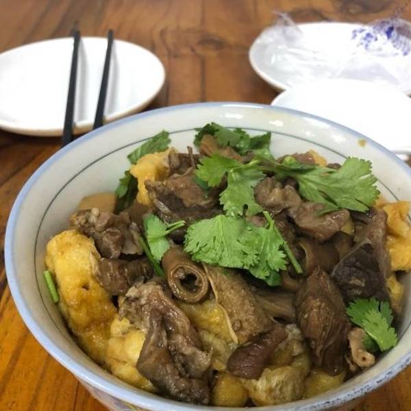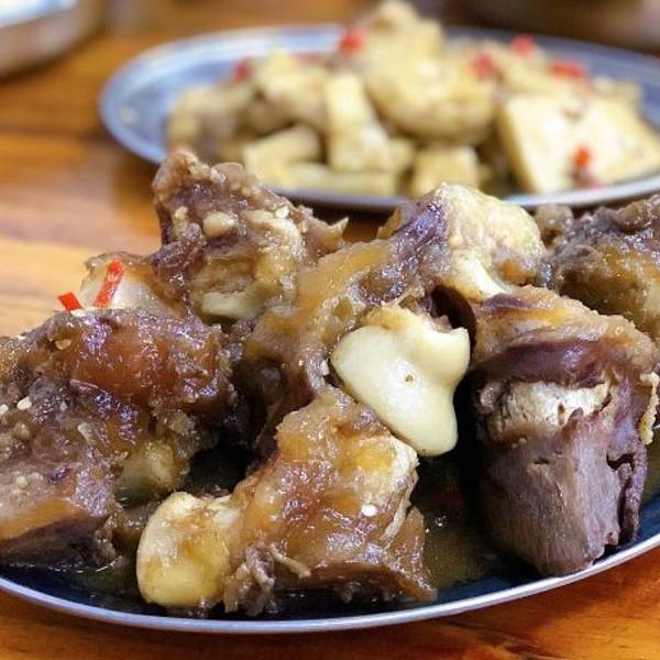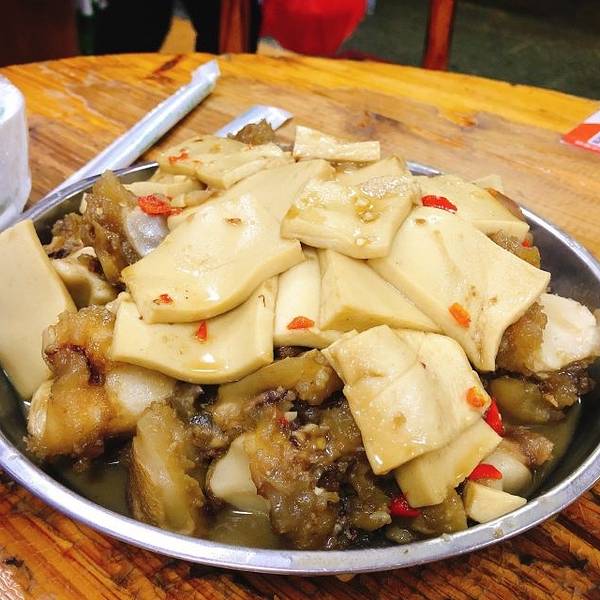 这家店是晚上7点半才开始营业,但一定要早点去,不然你会发现即便刚到营业时间,店铺门口都会排起长龙。来这里吃饭,真的一定要做好等待的心理准备,尤其是牛蹄要花时间等,他们家上菜是按点菜的先后顺序来,店子不大有点拥挤吵闹,但是味道确实没得说。 店里来的老熟客,进门就会跟老板说:来一份牛蹄豆腐,加辣。千页豆腐很入味又带有一点弹性,牛蹄一份有三个左右,炖得很烂很入味,软糯Q弹,一口下去满满的胶原蛋白。