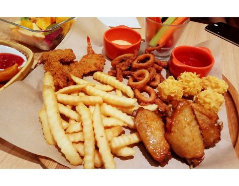 周末到金逸影城看电影后和朋友来这里吃饭,点了小份比萨、烤串拼盘,两份汤还有沙拉,买100元代金券80多块钱,用了一张团购劵,又付了58元,挺不错的。建议坐在窗边可以看夕阳。