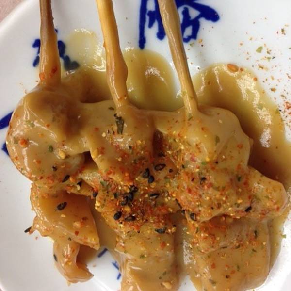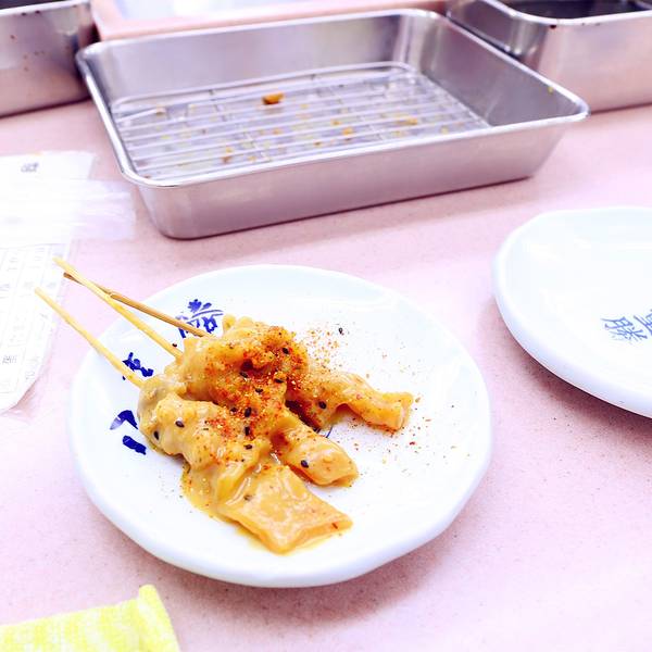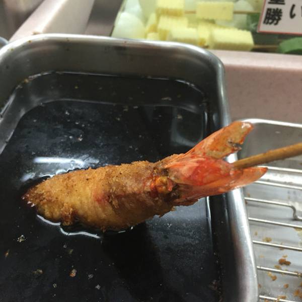 吧台桌子前有一盒类似酱油颜色的汤料,那是沾炸串的汤料,串炸好后浸入汤内,只能一次,不能重复沾取,因为不是一次性的汤料啊,然后就可以享受美味了。如果是味噌味道的炸串,就不用再沾这个汤了,本身就是有咸味的,店内有繁体中文菜单,点菜压力不大。