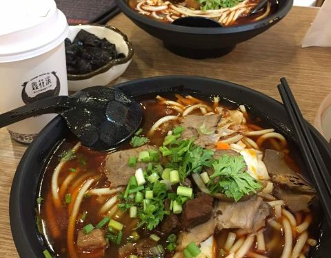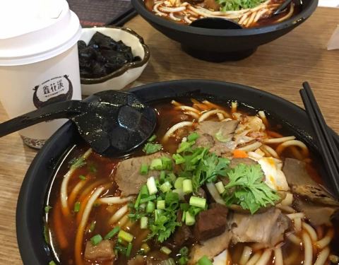 鑫花溪牛肉米粉(来客茂店)位于苏州市姑苏区桐径北路218号来客茂广场2楼205,营业时间:9:00-21:00,店铺电话:0512-68667581,乘坐公交317路 400路 406路 40路 816路 933路 949路 游3路 游5路 来客茂乘坐电梯上二楼,就看见明显的招牌鑫花溪,这家店厅面积不大,但人气很旺,餐厅里收拾得也挺干净的,窗明几净,现在门口的柜台上点餐,然后取牌号,选一个位置坐等服务员送餐上桌,建议选靠窗的座头,可以一边用餐一边欣赏下面窗外马路上的景致,餐厅内的装饰不错,墙上的贴图有和风味,上菜速度也快,这里特色主要是牛肉粉,有招牌牛腩粉、红烧牛肉粉、酸菜鱼粉、招牌牛杂粉、金针菇肥牛粉等,推荐全家福粉,里面有牛肉、牛筋、牛杂、卤蛋等,满满一大碗,汤汁口味偏重,牛杂有嚼劲,牛腩比较香嫩可口,牛肉粉的价格在15—22元之间不等,在点餐前,对服务员说一下是否需要放香菜,桌子上有酱油等调料,根据个人口味调,除了粉,主食还有米饭,有台湾卤肉饭和金针菇肥牛饭,价格都是18元一份,还有卤蛋、花枝丸、夫妻肺片、口水鸡、绿茶饼等小吃,味道也不错,价格在1—15元之间一份,还提供外送服务。吃完了可以去对面的西园寺逛逛,门票20元1人,寒山寺、枫桥、留园离这里也不远,这里连锁酒店挺多,住宿也方便。