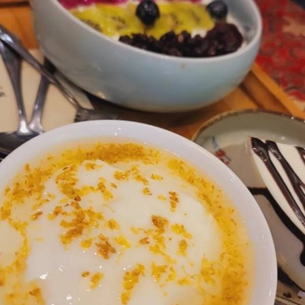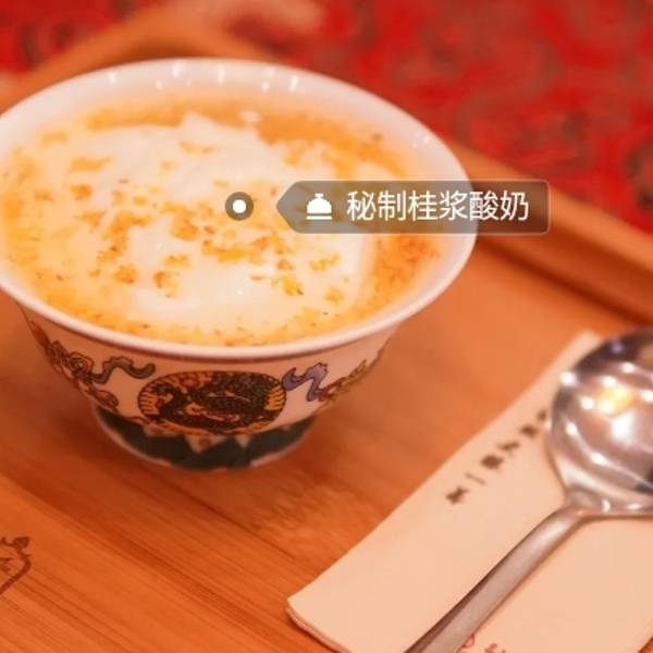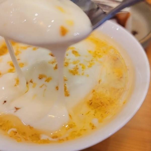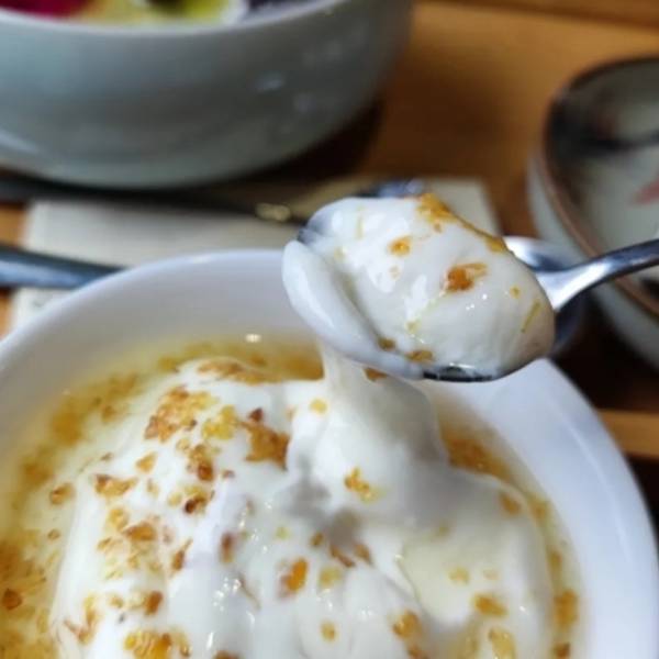 - 酸奶还会拉丝,口感就像在吃麻薯。很特别。第一口能吃到桂花的甜,酸奶是原味无糖的所以要靠桂花酱搭配着吃