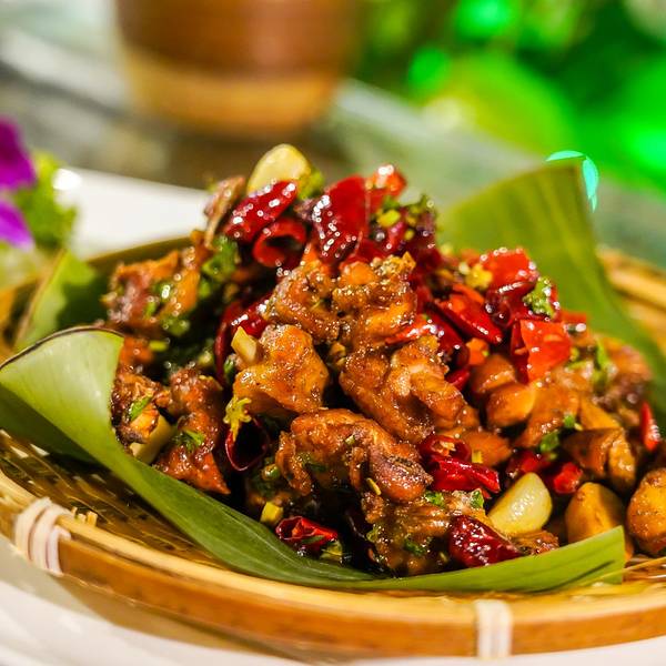 尽善百年古院餐厅也是出行前就已经加入行程单里的,已经有很多朋友给我推荐这家餐厅了,很多明星都来过,正好离方舟沐宅也很近,步行五分钟就到啦。进门后就是一个大大的院子,很有年代感,听老板娘介绍是他们家祖传的,世代经营,庭院布置的很古朴,很有当地特色,院子里到处都是植物,生机盎然,在这么美好的环境里享受美食,真是超级惬意!香草柠檬鸡,店里的招牌菜,必点NO1,鸡肉切成小块,很入味,特别的香草味,再加上干辣椒,焦香四溢,回味无穷,很适合四川人的口味。