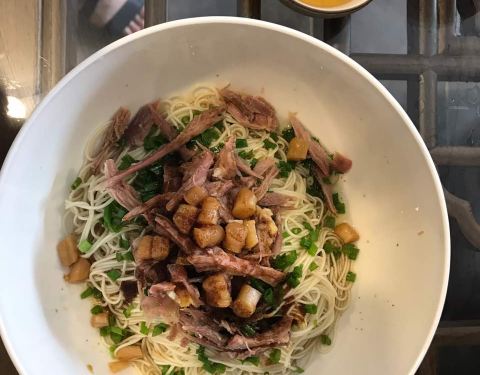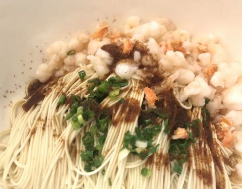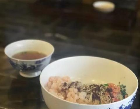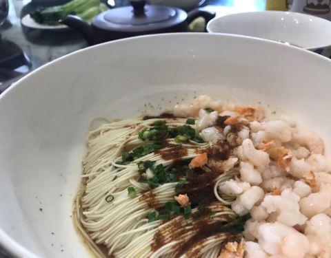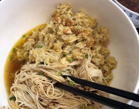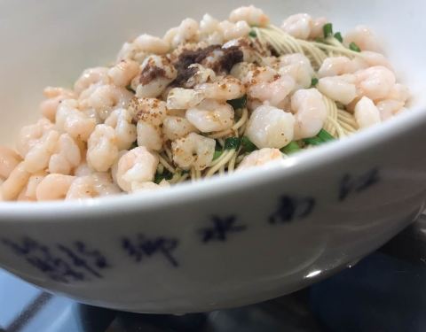 苏州面馆里的御面斋里的夏季特供—三虾面,所谓三虾面就是用河虾虾仁、虾籽、虾脑为浇头的葱油细面!我只能说这是一道功夫面。好吃!