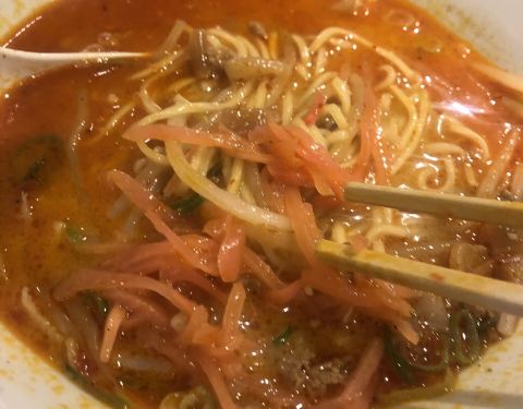 不需要像一兰拉面先买单及选择配料、烹调方式,当天选择赤丸新味,面条软硬适中,但汤头很咸,喝起来有浓浓咸鸭蛋黄的味道,还好有三道小菜可稍减油腻感。单人区座位稍嫌拥挤,坐起来有点不舒服。