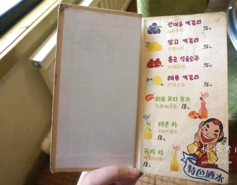 重要的事情放在第一句写,不要相信点评上的定位,直接带进花坛里面.....(╯▽╰)代金券只能工作日的午市使用,阿拉十一点二十到的,店里只有一桌客人,之后陆续有来。菜单做得很可爱,手绘的版本,粗略看了下价格,算蛮公道的。 发朋友圈标明地址,还可以送饮料噢,阿拉选的芒果米酒。服务员说是自家酿的,酒精的浓度不是太高,淡淡的芒果味道,冰凉的感觉很适合夏天喝。