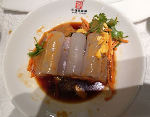 谷谷鸡象山海鲜城(凉城店)一到饭点生意就非常的好,包房必须提前几天才能订到,点了名炉烤鸭,皮很脆,酱料也很好吃,椒盐龙头烤也是味道鲜美,爽口菜梗好像是用花菜梗做的,第一次吃到,特别的爽快味道不错的。