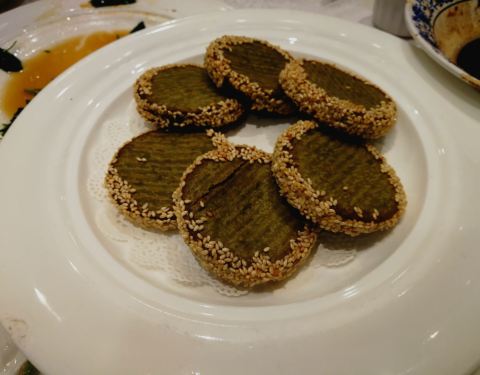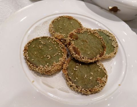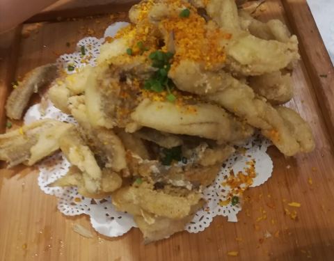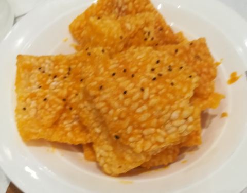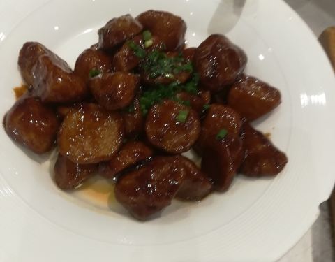 这次去谷谷鸡家吃饭,菜点的并不多,但味道都还不错,咸蛋黄锅巴上面撒了一点黑芝麻,锅巴吃上去有锅巴和咸蛋黄香味之外还有芝麻香,咬一口嘎嘣脆,最后一道点心红豆沙圆子不错,圆子糯糯的不是很甜。红豆沙勾芡。大家都觉得好吃。