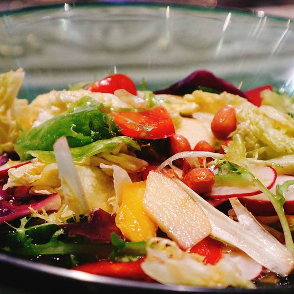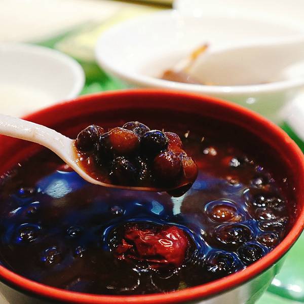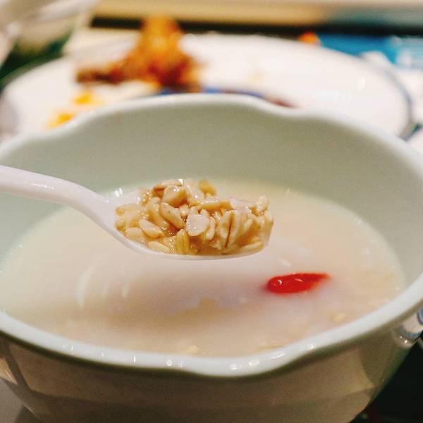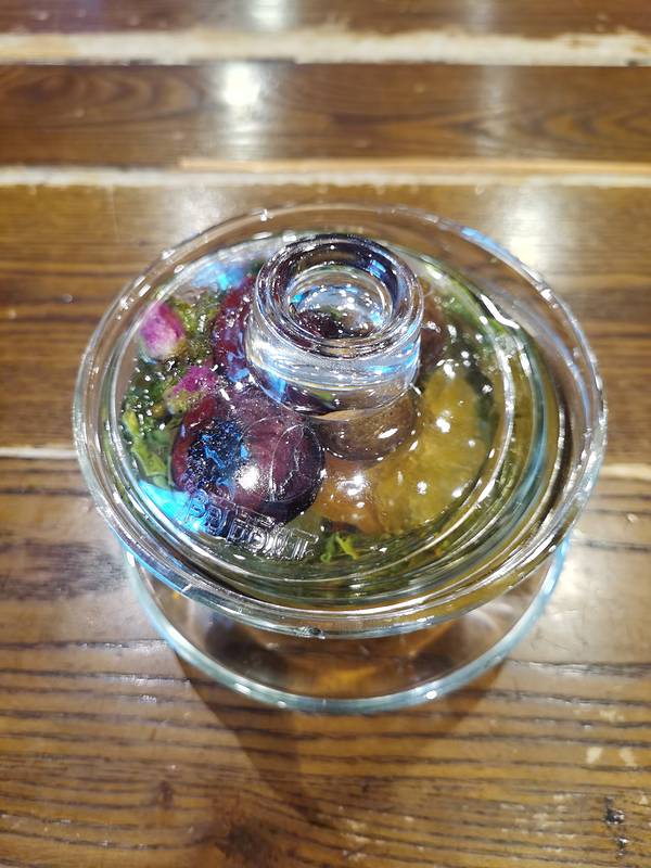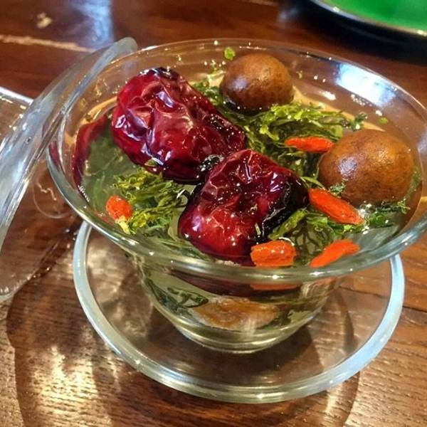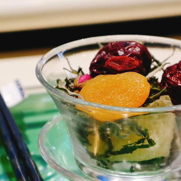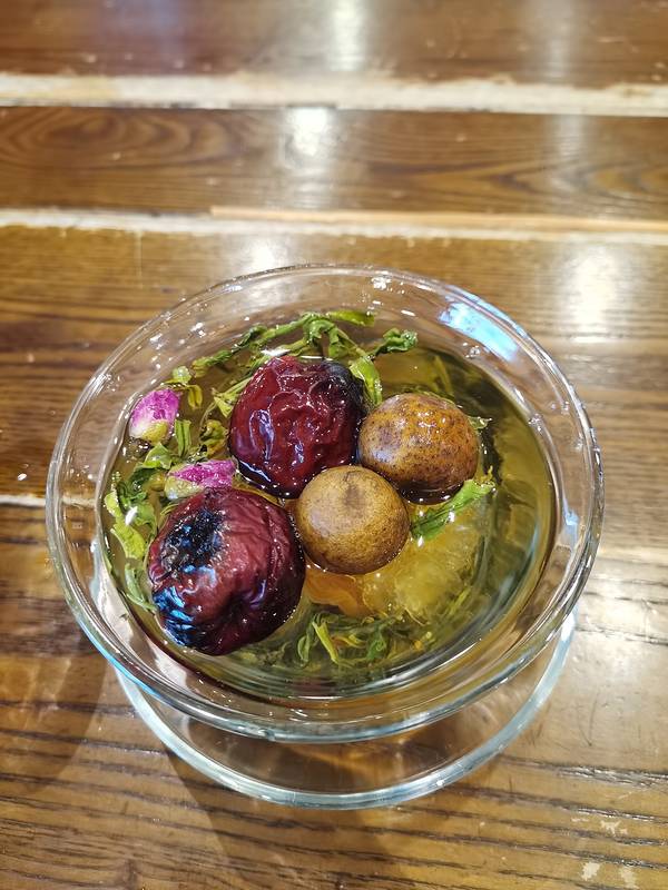 先说三炮台,哎呀妈呀实在是太好喝了。一盏玻璃碗,满满登登的用料十足。绿油油的春尖茶做底,一棵红枣、两颗桂圆,三四粒枸杞、葡萄干和玫瑰干,再来一片厚实的杏干和大块黄冰糖,热水泡五分钟,三炮台就得了。黄冰糖不易溶化,所以茶入口微涩,但喝到底,开始融化的黄冰糖润着口腔,回甜的滋味就很美妙了。那种满满融化的速度刚好足够每一盏的茶水,续杯宝藏此处三炮台力拔头筹。