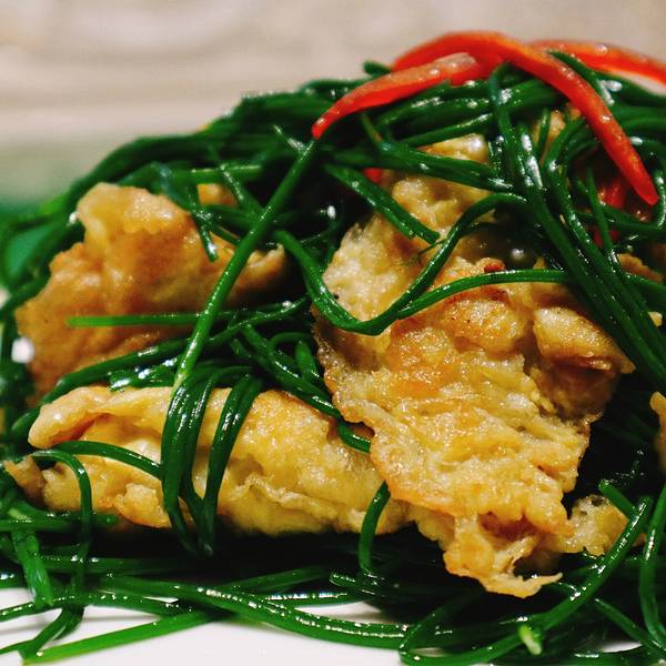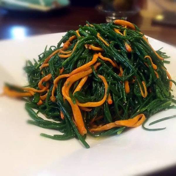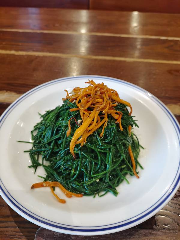 的确是实实在在的羊肉,稍微有点顶的时候,虫草拌沙葱就要闪亮登场啦。食物版图又点亮了一颗亮晶晶的小星星。据说沙葱是长在荒漠里的一种绿色蔬菜,看起来像是短短的细棍状韭菜,味道吃起来又是介于韭菜和生蒜之间的味道,越吃越猛烈,是佐羊肉的解腻神器。