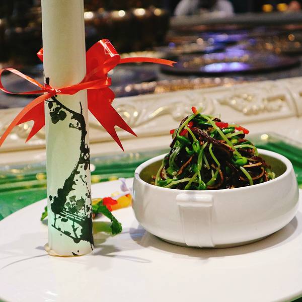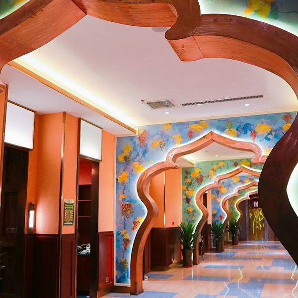 上到2楼,一个超大的铜壶矗立在面前,随后才得知此壶为纯手工打造,在感叹师傅真为“能工巧匠”之时,小伙伴已在上3楼的电梯处喊我,这才梦中惊醒,随后快步跟上。上到3楼,电梯刚开的那一刹,我都惊呆了,一条梦幻又极具民族特色的走廊出现在眼前,拍照打卡操作行云流水,随后跟着大队人马前往传说中这家餐厅最大的包厢。一个转角即是又一番景象,说它富丽堂皇一点都不为过吧?果然是最大的包厢,这点毋庸置疑了,容纳20多人不成问题,上桌点菜,由于我们人数众多,点的菜品也比较多,所以我们得分为必吃系、热菜系、凉菜系、小吃系。#必吃系