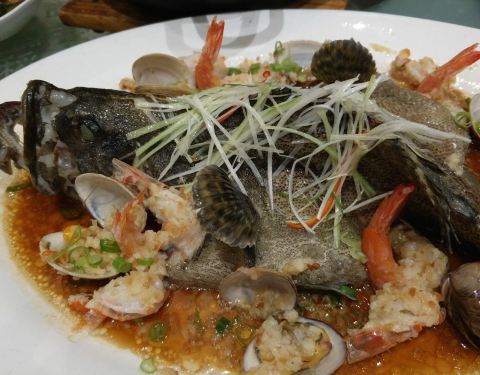 店堂挺宽敞的,桌子不拥挤,这点很不错。粤菜为主,略有创意,但比如花蟹炖土鸡这样的创意菜居然没有。点了条石斑鱼,品质还不错,肉质细嫩,比较新鲜。烧鹅皇挺入味的,不用蘸酱也挺好吃,稍微有点油。酱油腊味炒饭味道不错饭略微硬了点。