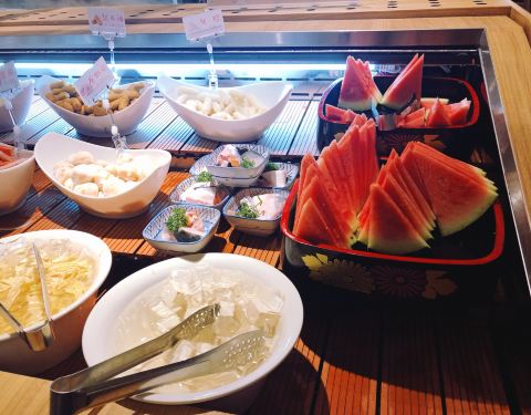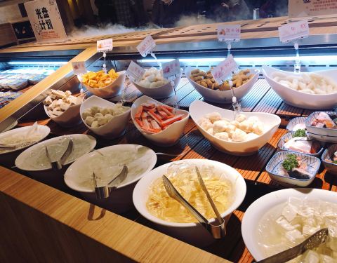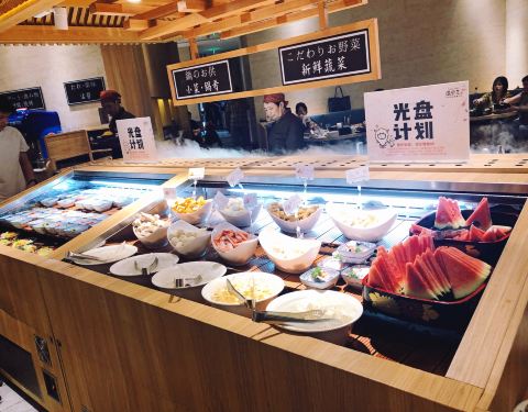 温野菜属于日式火锅,所以大部分菜品是不需要自取的,有一本菜单你选好锅底、小菜、肉类和蔬菜拼盘,店员会依次端上来还有一盘刺身(刺身是每桌只限一份的),甜品有大福、绵绵冰、冰淇淋。小菜种类很多,比较推...温野菜属于日式火锅,所以大部分菜品是不需要自取的,有一本菜单你选好锅底、小菜、肉类和蔬菜拼盘,店员会依次端上来还有一盘刺身(刺身是每桌只限一份的),甜品有大福、绵绵冰、冰淇淋。小菜种类很多,比较推荐辣白菜和金针菇拌竹笋,这两道都很入味口感脆脆的。其他自助的菜品包括了各种丸子,菌菇 、蔬菜等等,有几种丸子里面是芝士夹心咬开来会爆浆,超级喜欢,还有鱼饼的配料也很丰富也很喜欢。