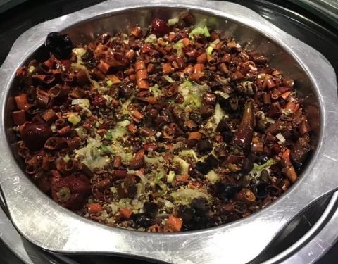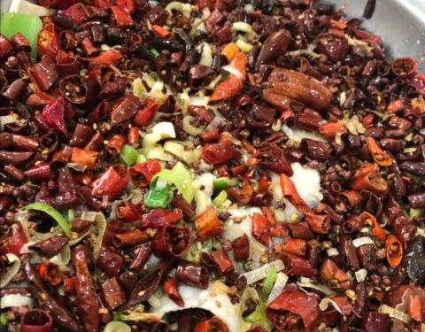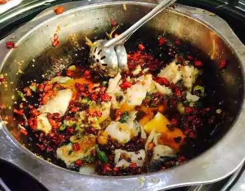 - 端上来一大锅,辣椒和花椒铺满了,麻辣鲜香,辣椒先帮你舀出来,喜欢的话可以带走回家吃