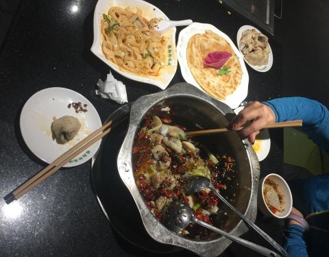 无刺的巴沙鱼,吃起来很爽。端上来一大锅,辣椒和花椒铺满了,麻辣鲜香,辣椒先帮你舀出来,喜欢的话可以带走回家吃。鱼肉香软吃完鱼加汤涮菜也很棒。 面条免费挺实在的优惠,唯一不好的就是他们家的卫生实在是不怎么样