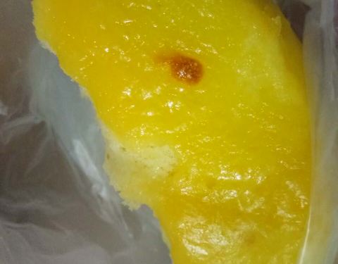 表面有的地方烤糊了,糊的地方很硬,蛋糕贴别甜,齁的慌的那种甜,平时很喜欢吃甜点,这一款真的不敢恭维