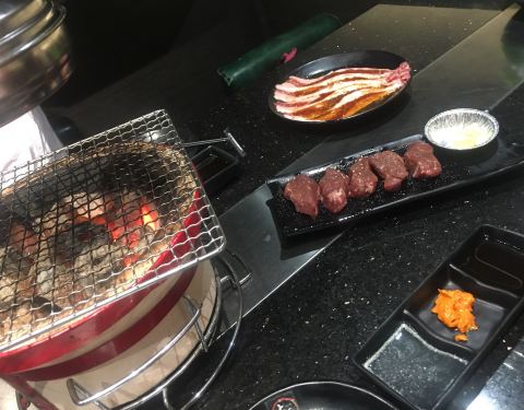 最近烧肉吃的有点多…相对来说这家就比较普通了。小炉子放桌上烘得我脸都发烫… 服务员不忙的时候可以帮忙烤肉,但是忙起来就不管我们了… 牛肉还不错,其他就一般了……