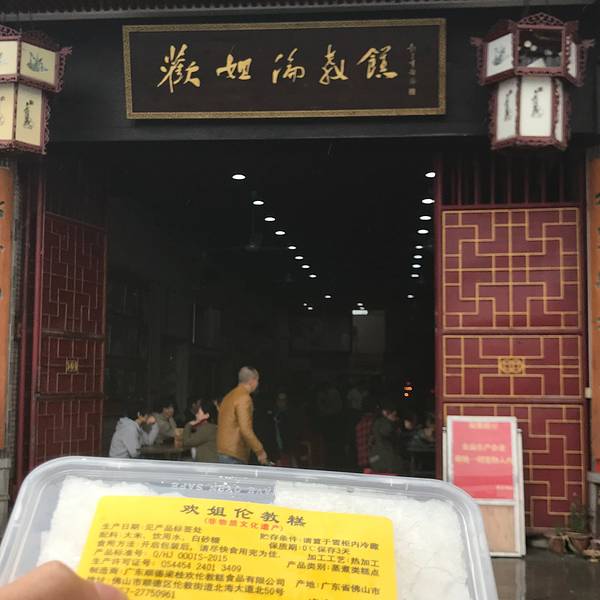 算是不知道怎么回事被导演拉来的吧 出来才注意到是广东省一个非物质文化遗产诶 店铺还挺大的 可以很多人一起坐下来 很有那种文化的气氛 有很多种糕可以卖 大多数是那种需要回去自己蒸的 也没有试吃!!这一点差评!!!只和朋友一起买了一下白糖伦教糕 感觉就是很平常很平常的更甜一点的发糕 黄糖伦教糕没有吃 他们说感觉 就是变了颜色的白糖伦教糕 捂脸 不过还有挺多那种10块钱一盒(大概四块)的挺精致的小点心的 感觉那个会好吃一点??? 总之还是打了一个卡啦