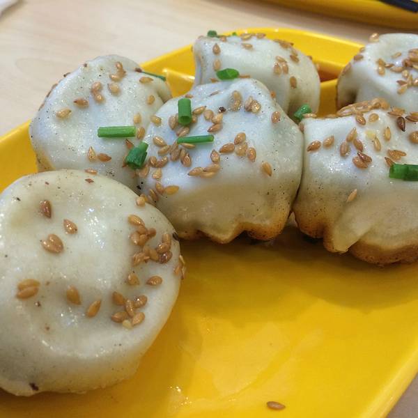 黄色芝麻铺面的生煎,是荠菜生煎,是荠菜加少量猪肉做成的。肉感不重,适合素食的女生。【三拼生煎】