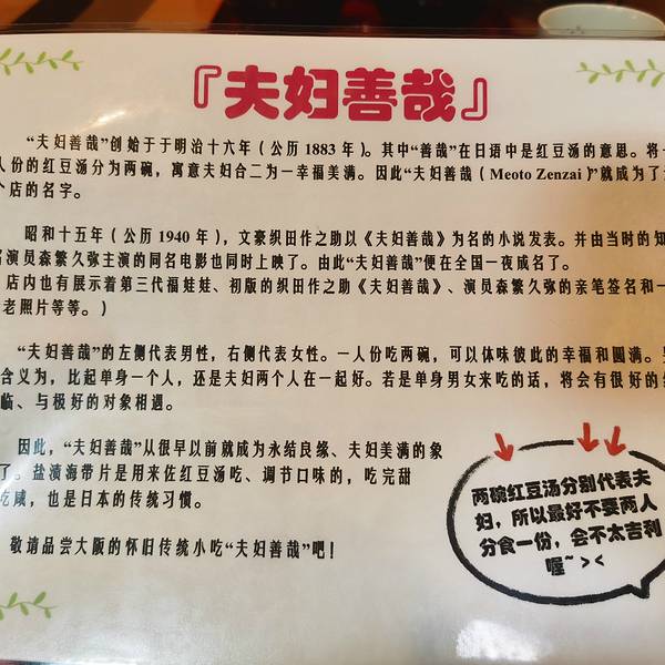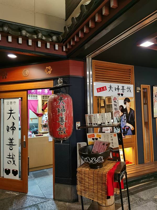 夫婦善哉,一家很小的红豆汤店,因为去之前看过好多的攻略和游记,看到好多人都推荐去法善寺玩一定要去品尝,所以这次列入了我的出行计划里。傍晚时分去的,导航其实并不准确,我们也算是歪打正着找到的。店内很...夫婦善哉,一家很小的红豆汤店,因为去之前看过好多的攻略和游记,看到好多人都推荐去法善寺玩一定要去品尝,所以这次列入了我的出行计划里。傍晚时分去的,导航其实并不准确,我们也算是歪打正着找到的。店内很小,但是布置的很暖,很温馨,很适合情侣和夫妻来。红豆汤是一套的,不单卖,一碗冷一碗热,因为本人其实并不喜欢吃红豆味的东西,所以对于红豆汤的味道说不清楚,但是因为喜欢店内环境,还有就是店内宣传的故事,所以以后还会带老公再去的。