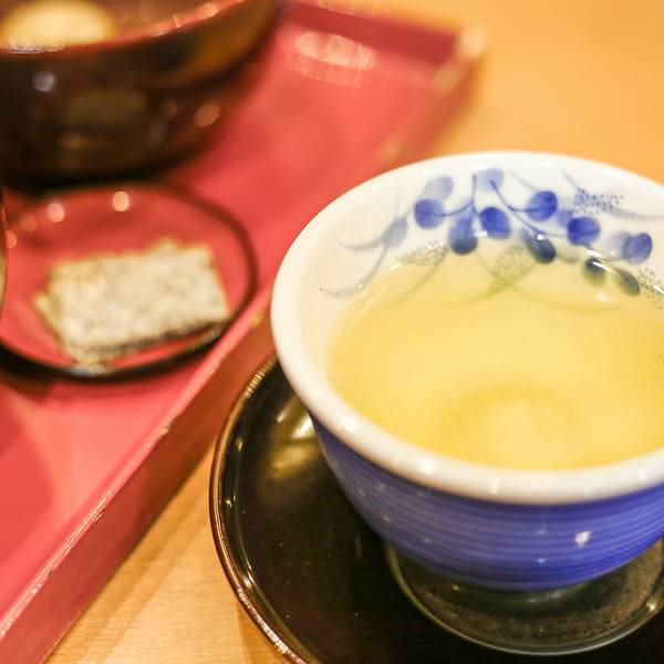 而且是必须一人一套的,如果说想只买一份,一人尝一个半碗就够了,是不行的。这样相当于单独卖出一碗,打破了美好的寓意。两个人花了一百就吃个红豆汤,呵呵,为了美好的寓意,还是吃吧!夫妇善哉采用高级小豆“丹波大纳言”作为原材料,在经过约八小时的锅煮之后,再静静放置一天左右的时间。这样糖份就很好地渗透到了大豆中,使其拥有一种沁甜,而且形状还是一粒一粒的很完整。因为红豆汤很甜,为了给顾客平衡一下口味,店里还给每人准备了一片盐海带,这海带也是经过严格挑选的北海道道南产的天然海带。但是味道实在是咸得受不了,感觉是直接在吃盐啊!或许就是为了体现夫妻之间要甘苦与共吧!搭配的煎茶是京都南部的宇治茶,味道偏苦,应该是和盐海带一样的用途,突出甘苦与共。