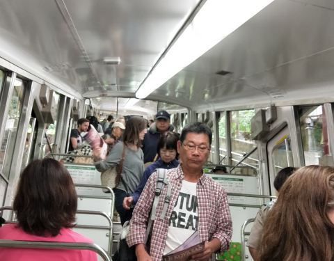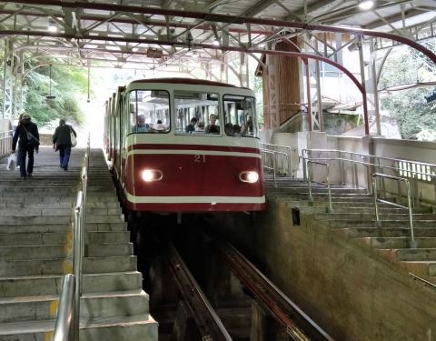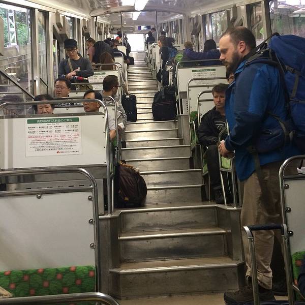 我们当天出发的有点晚,十点才出门,到了高野山已经是中午了。出了地铁站就是高野山的山脚下,地铁口紧挨着缆车站,从山脚去往山顶,必须搭乘这辆特别陡峭的缆车。缆车的轨道铺在山坡上,差不多45度的倾斜角度上去,看起来特别危险。建议站在车头或者车尾,视觉上更刺激一些。 展开
