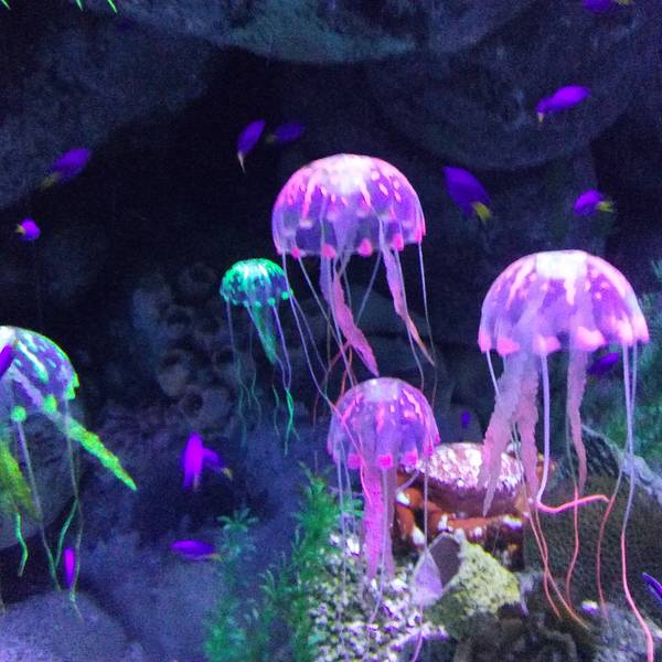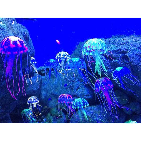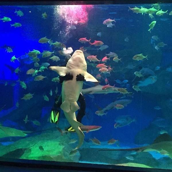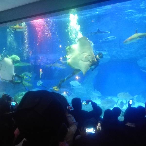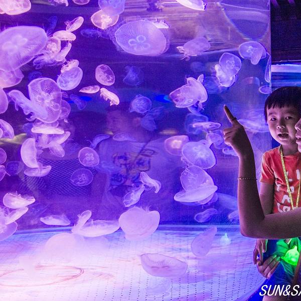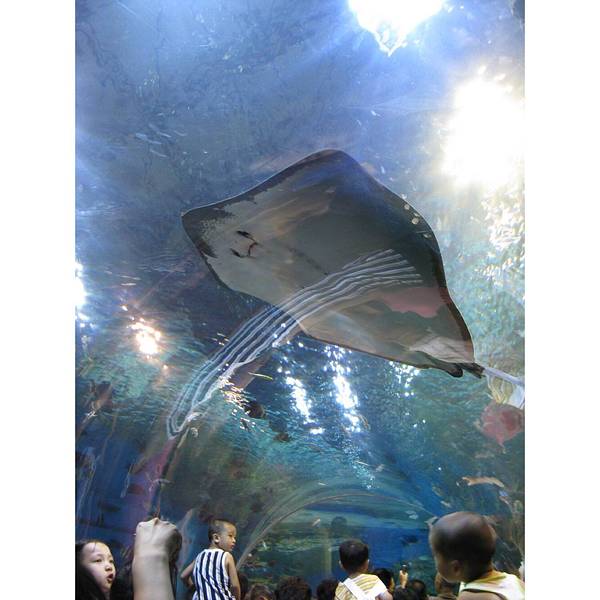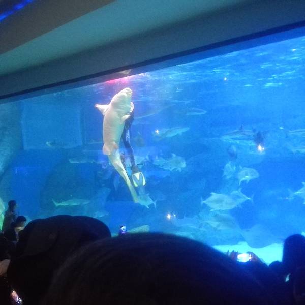 上下挥舞的触须,就像飘带一样。随着灯光的变化,它也如变色龙一样,五彩斑斓。这一种透明的水母,更是显得较弱。但是外貌较弱的它 ,却有着坚强的一面,有着自己的防身武器。换做人类,也是一样。麻麻仔细的讲解,也让他会分神,因为他在看爸爸拍照。果然小朋友1岁抓阄的第二志愿是相机。要是真能如抓阄,第一志愿是医生,业余兴趣是摄影师的话,那就简直太完美了。旁边的鱼池人不多了,大家都赶去鲨鱼表演区域了。马上,鲨鱼和人美表演就要开始啦!现场真是人太多。为了证明,我影把漆黑的照片,拉亮,请忽视这骇人的噪点吧。