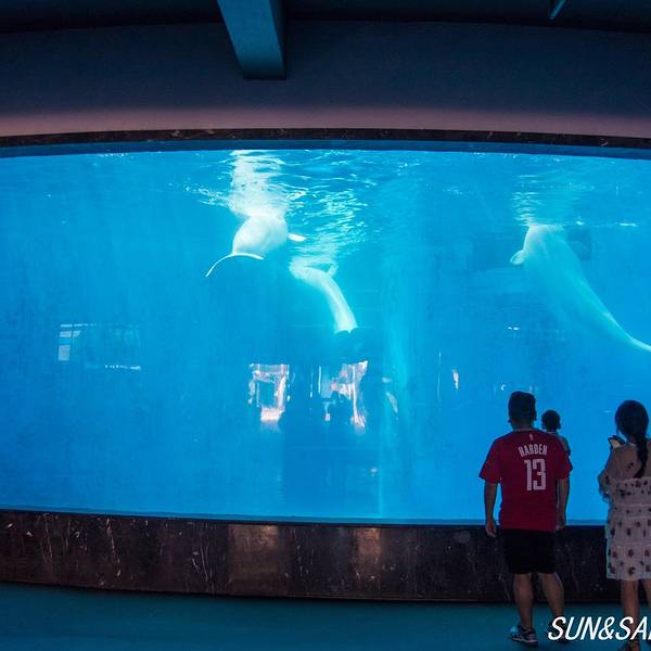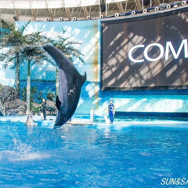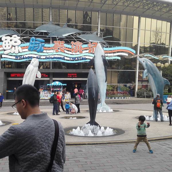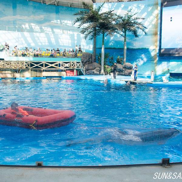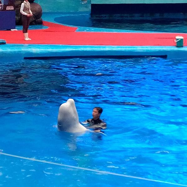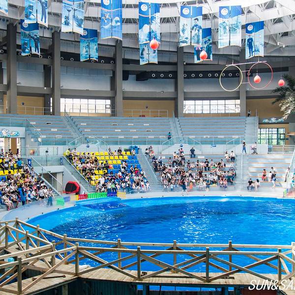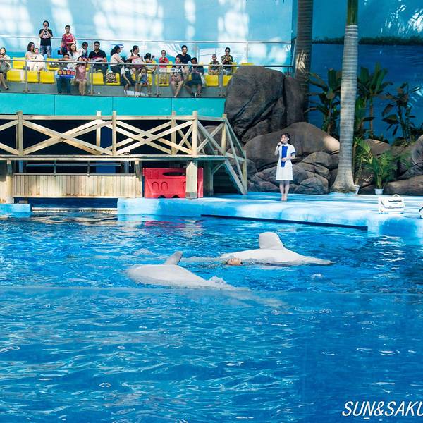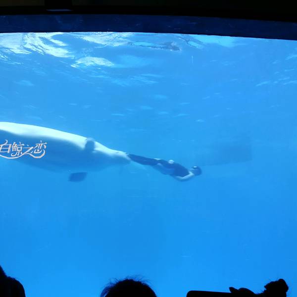 鲸豚表演馆上下三层,楼上的表演区游泳池,非常巧妙的在一楼做成了透明的大观景区。可以想象,如果没有在楼上观看节目,而是在一楼看,也是会有不同的视角哦。巨大而温顺的白鲸们,正在畅游呢。时间不够啦,我们赶紧上楼。但是有必要在二楼的区域了解一下鲸哦。集观赏性和科普性为一体的场馆,很喜欢。场馆很大很专业。慢慢的,三三两两,人群逐渐集中起来啦。我们提前了15分钟到,居然还坐到了第一排呢。现代化的穹顶。表演开始前,旁边的驯养池里,小海豚们在做着准备。大型的LED屏幕,在表演的时候一直做着直播。我想,像十一长假的时候,坐的很远的观众,是很需要这样的直播的。开始啦,工作人员们在录播了一个小MV,bigbang的bangbangbang一响,我就是想活动活动筋骨。现在是补充体力时间,我们的后面旁边都在默契的喂着孩子呢。儿子,你来表演一个好吗?