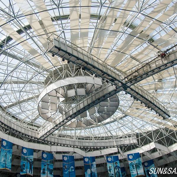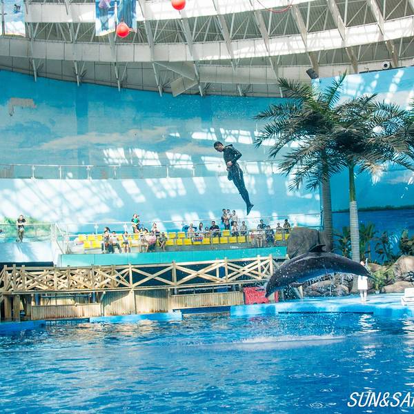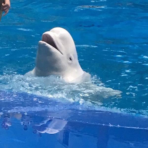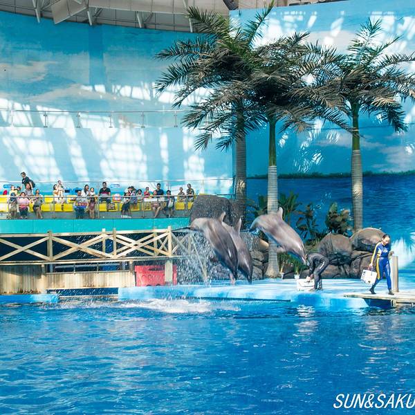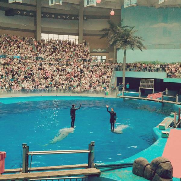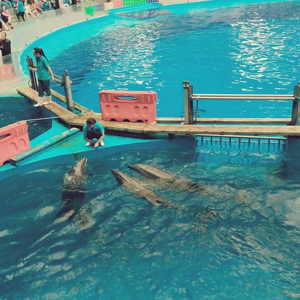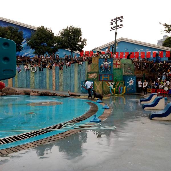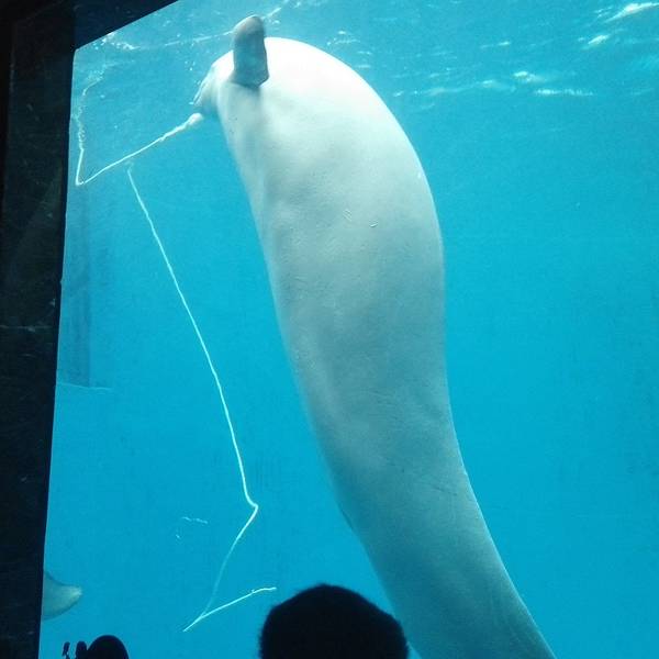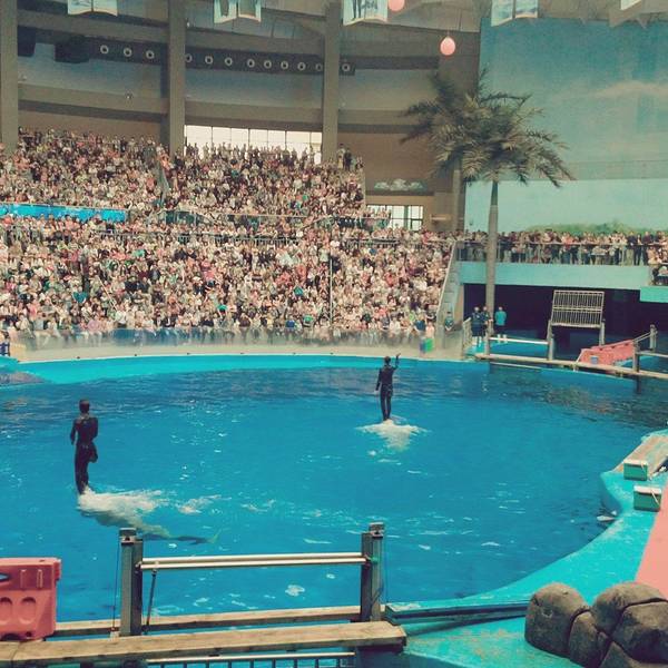 鲸豚表演馆上下三层,楼上的表演区游泳池,非常巧妙的在一楼做成了透明的大观景区。可以想象,如果没有在楼上观看节目,而是在一楼看,也是会有不同的视角哦。巨大而温顺的白鲸们,正在畅游呢。时间不够啦,我们赶紧上楼。但是有必要在二楼的区域了解一下鲸哦。集观赏性和科普性为一体的场馆,很喜欢。场馆很大很专业。慢慢的,三三两两,人群逐渐集中起来啦。我们提前了15分钟到,居然还坐到了第一排呢。现代化的穹顶。表演开始前,旁边的驯养池里,小海豚们在做着准备。大型的LED屏幕,在表演的时候一直做着直播。我想,像十一长假的时候,坐的很远的观众,是很需要这样的直播的。开始啦,工作人员们在录播了一个小MV,bigbang的bangbangbang一响,我就是想活动活动筋骨。现在是补充体力时间,我们的后面旁边都在默契的喂着孩子呢。儿子,你来表演一个好吗?