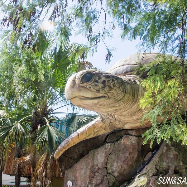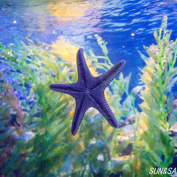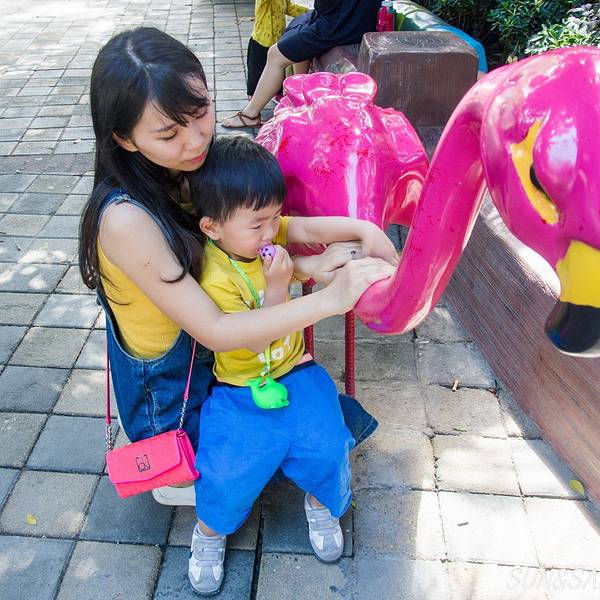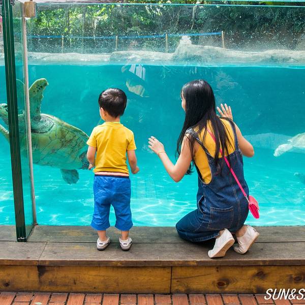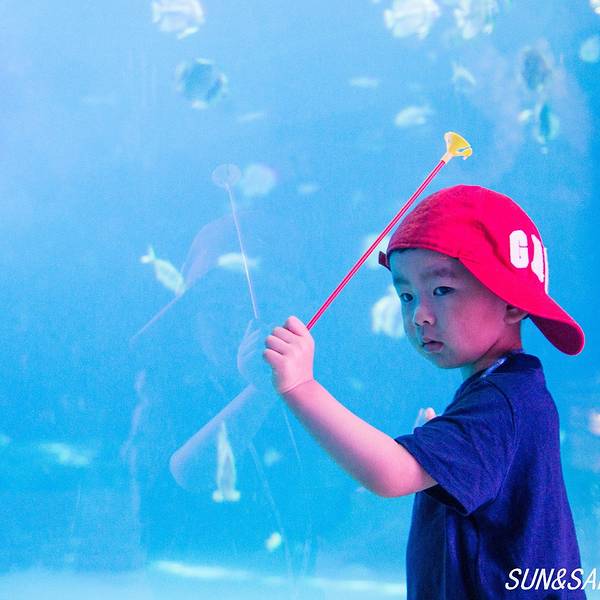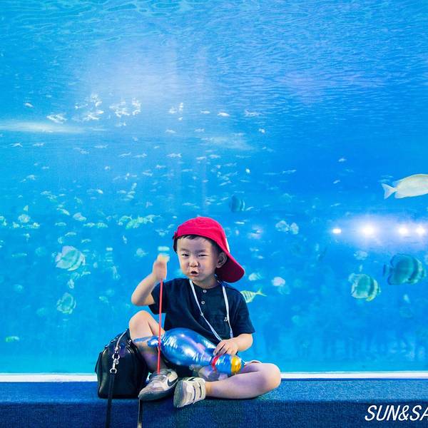 我想,大部分园内的人都聚集过来了吧,突然一下好拥挤。毕竟今天是个周末呢,阖家欢乐的时候呢。除开这一场表演,其实人流是很分散的,没觉得人特别多呢。爸爸带着小立可赶紧找一处站立,我便扛着相机,打算趁着人少到处去看看。现在正是我扫街的好时候。这颗海星就傻傻的帖子玻璃上,真是和我去泰国时买的那颗假海星发卡,一模一样!看着这样肉肉的海星,我怎么突然想吃绝味的鸭掌呢= =我找了一个蜜汁角度,让温和的火烈鸟看上去在恨我一般。还是恨死一滩血的那种眼神。尴尬。风车门帘,感觉设计者好有少女心。走着走着,发现了别有洞天。这里的水帘很凉快,后面的山洞有很多休息座椅,索性坐下来等爸爸和宝贝看秀结束来和我汇合。来来来,老SUN ,给我拍一张吧。于是,顾不得地上的湿漉漉,以前不喜欢摄影的老SUN同学,无怨无悔的蹲趴下来。现在,我们算是有了共同 的兴趣爱好,真好。小立可也被这火烈鸟吸引了过去。对着他一顿乱吹口哨:我喜欢它,我要给它唱歌。OH ON .海龟馆的造型有没有很别致哇。一只千年老龟爷爷驻守山洞,里面的小孙儿们可欢快的游着呢。这里除了海龟,还有小红鱼——抱歉,实在记不起它的名字啦。索性简单粗暴的按照颜色划分吧。这个肉嘟嘟的小白鱼,真的非常漂亮。柔光双摄,没有照亮到它的美。海龟海龟!想当年在菲律宾的APO岛为了追逐看他,可是要了我的老命,累死啦。现在它就在我面前呢!