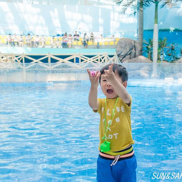 羞涩的小立可终究是走了过去,可是好害羞啊!两手紧紧的拉着裤子呢。和他扔球玩,解放了他的天性。小朋友自嗨了起来。虽然嘴里一直念叨着我听不懂的,他居然说他在说唱。什么是说唱呢?就是妈妈车上放的那个音乐?OH ,难得有一首,你就喜欢这范?长大了只要不FREESTYLE就好 = =表演开始啦。白鲸天使伴着音乐,和训导员跳起来舞。两个女训导员,真是飒爽英姿呢!小海豚登场啦,不仅唱歌给我们听,还会学企鹅一摇一拐的呢!一个自告奋勇的小男孩,还坐进了船里,任由小海豚拉着他环游呢。小海豚的跳跃一向是最美的。在半空画下的弧线,让小立可看的出神入化。他们要拍打水花营造气氛呢!!啊,我的相机!最后出场的男驯兽师,居然深入水底,任由小海豚冲顶,把他高高的丢出半空。真是帅极了。期间还有幸运观众能上台和小海豚亲密接触,亲亲呢!节目的可看性,参与性,都很高呢。哈哈哈,今天的活动真是太好啦。小立可一个下午都在念叨的玩水玩水,终究还是让他下水了。天啦,小立可像巅了一般的兴奋。又叫又跳!孩子的世界,真的很简单。此时,舞台上热情的异域美女,正在跳着桑巴舞。编排挺好看的。趁着还没结束,赶紧拉起可可,一来光上身怕他感冒,二来还想给他拍两张。赶紧给他换了装备,此刻快闭园啦。所以,还是应该再早一点到哦,大半天的时间,是绝对需要的。调皮的小眼神呢!此刻你猜他在干嘛:真的在唱跑调的祝你生日快乐!天啊,谁过生日?完美的玩水大作战收官!水,永远是孩子最爱的主题。夏日炎炎,快带孩子去玩水吧! 展开