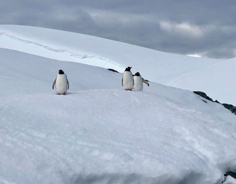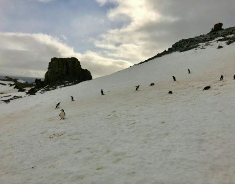 半月岛就是一个月牙型的小岛,半月形的半月岛仅有2公里长,从上往下看形似一弯月亮,三面是冰川雪山,一面临海,我们登陆的地方也是企鹅下海捕食的地方,这里还是阿德里企鹅和巴布亚企鹅的重要繁殖地,突然发现海...