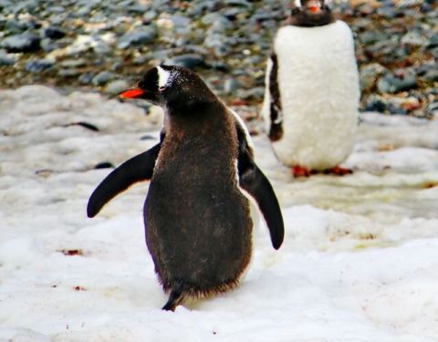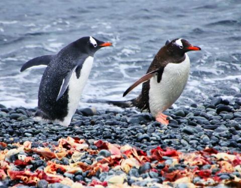 奇妙的是,居然有两种毛色的白眉企鹅相伴而行。一种棕色,一种黑色,乍一看还以为是阿德利企鹅呢