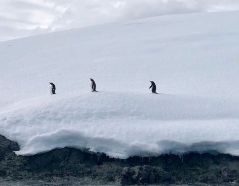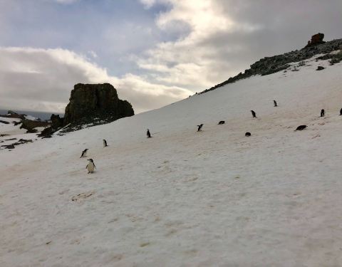 半月岛就是一个月牙型的小岛,半月形的半月岛仅有2公里长,从上往下看形似一弯月亮,三面是冰川雪山,一面临海,我们登陆的地方也是企鹅下海捕食的地方,这里还是阿德里企鹅和巴布亚企鹅的重要繁殖地,突然发现海面上一排企鹅正上蹿下跳的起起伏伏,好像是晨前的热身运动,企鹅是群居动物。