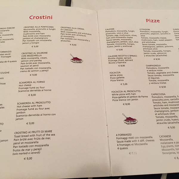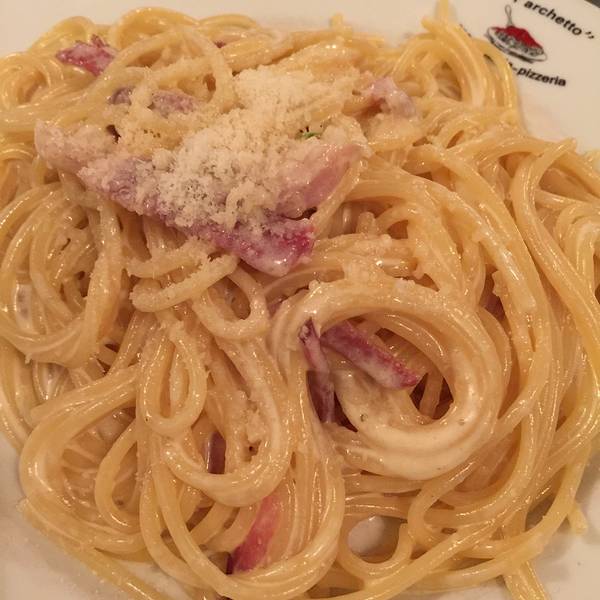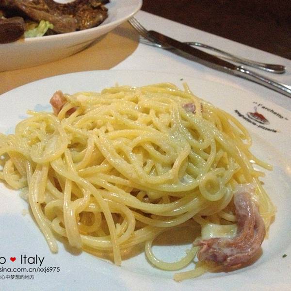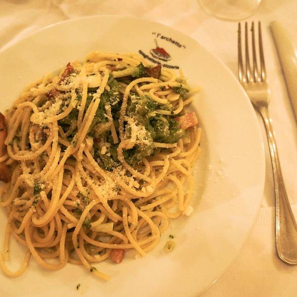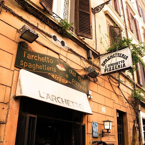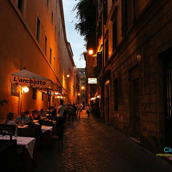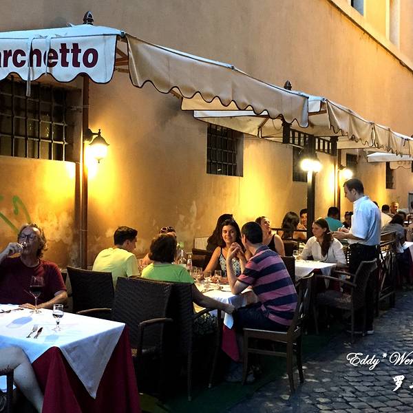 晚餐到许愿池附近有一家超级有名的餐厅—L‘archetto(小拱门),(Via dell’Archetto,26)据说经营着罗马最美味的意面。小拱门有两道招牌菜——Chanel以及Bomb。其中Chanel以番茄、大蒜、龙虾、白兰地、鲜奶油等调味,奶香味十足,而Bomb则由青花椰、烟熏培根、红辣椒调味,口感略微有些辣辣的。建议挑选「伦敦之烟」(Fumo di Londra),它的酱料是以猪肩肉做成的腌肉Speck、烟熏水牛鲜奶酪、鲜奶油与帕米加诺奶酪混和而成;「奇瓦哥」(Zivago)的酱料则是由马哈鱼、鱼子酱、番茄、香菜与鲜奶油所调制。另外[Chanel]也很好吃。大馅饼(Calzone)(包着番茄、香菇、火腿、Mozzarella鲜奶酪、鸡蛋与橄榄)也很好吃。特别提醒:这家每天生意都很好,最好在晚上7:30以前到,不然需要等座位。