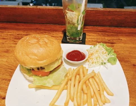 环境真的不错,窗外就是海滩,口味也很好,草莓冰沙酸酸甜甜,鸡排的肉老了点不过酱汁挺好,鱼排的辣酱很不错