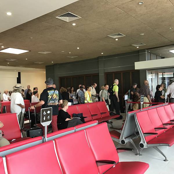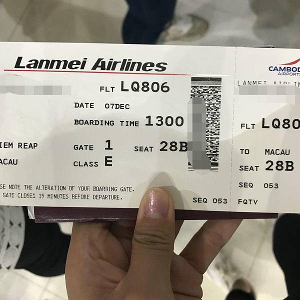 十点半出发去机场,13点的飞机回来。在候机的时候我听了吴雨霏的《吴哥窟》。过安检的时候居然拿着我的护照叫我要tips,我假装听不懂,东张西望,然后他说了小费,我还是没有给。最后他会拖不过你,让你过的。而我有的同事就给了。另外有可能他会先给你护照,不给你机票,心太大你就这样走了就麻烦了,然后我书包里面保温杯的水都没有检查出来,服气了。 这么大个暹粒机场,没有热水,要花钱去餐厅买,2美金一杯,小孩子冲奶粉老人家吃药简直不方便,我们带的泡面也没有吃到。小机场,没有廊桥,没有登机口,自己走过去。提前了15分钟起飞。Daisy-Daisy-Daisy就是我了啦小小的值机大厅来时在澳门机场称是12.5kg,怎么说,还是进行了物质交换的来时是LQ 807,走时是LQ 806在候机厅就能看到玻璃窗外的飞机了,其实这机场也是很小的。隔壁队伍是去新加坡的哈哈哈,看到外面的小动物,好萌蠢。没有廊桥,也没有交通巴,就这样登机了刚好我靠窗的位置的窗户是被刮花的,所有照片有种很不清晰的感觉,小飞机,等够人就出发了,比预计早了15分钟起飞。再见了暹粒,再见了柬埔寨~~