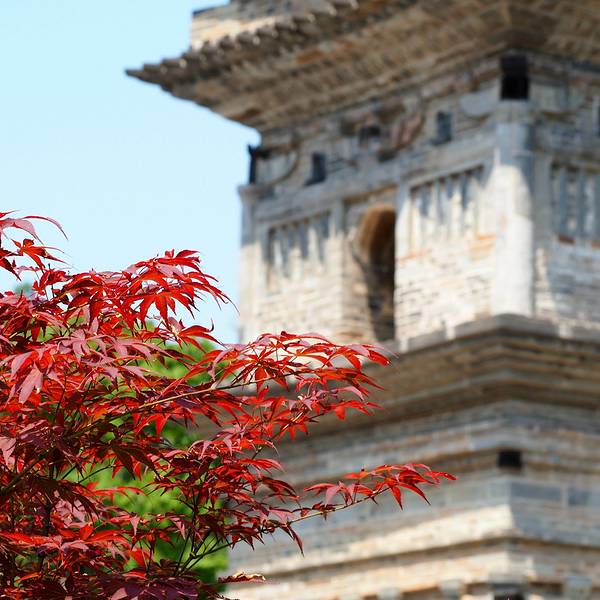 在现在的敬亭山,广教寺和广教寺双塔可不是一个地方,两者隔得还有些远。原因是古代的广教寺早已被毁,广教寺双塔是古广教寺仅存的遗物,现在敬亭山上的广教寺则是现代所建。据考证广教寺双塔修建于宋哲宗绍圣三年(1096年),距今已有九百多年,这两座古塔也成为敬亭山最古老的建筑了。不用看票,直接进去如今两座古塔都已被围挡保护起来,周围好像还有很多工程在做,仔细观察塔身,还能看到许多嵌入的佛像。有些佛像已经破损五月底的枫叶还没有败塔顶也已破损 展开