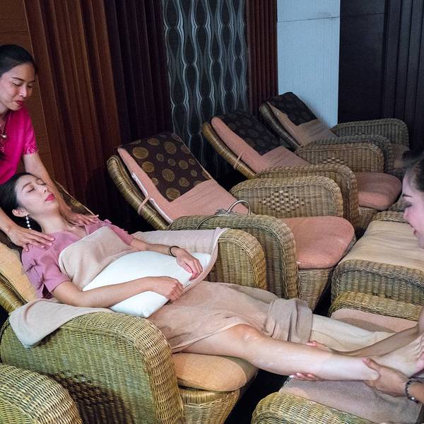 时间转瞬即逝,马上在泰国度假的时光就要结束。最后一日,想要给自己和家人买一些礼物。还记得当年看《泰囧》的时候,宝宝拿着一长串的“心愿清单”一一要实现。似乎,每次来泰国,我也是带着一份属于自己的“泰国旅游必买清单”而来。 比如,钟爱传统工艺的我,每次旅行送给自己一份当地特色的礼物,成了多年了的习惯,也是每一段旅途最好的记忆。 比如,给家里的长辈们和周边的闺蜜们,带回各种特色香氛、工艺品和化妆品。当然,还少不了大家最爱的美食。 面对我的这一份“心愿清单”,沛晴依旧信心满满,直接将我带到了Amarin Plaza。从酒店出发直接乘坐天铁BTS 在Chitlom 站下车,2号出口便是。与一般的购物商场不同,Amarin Plaza更注重于传统,商场内集中了众多的泰国纺织品和高级定制成衣。顺着扶梯,一层一层的往上逛,似乎是进入了一个巨大的手工艺聚集区,各种款式和风格叫人目不暇接。 我最喜欢的是位于2层的PikLik,一眼望去便是舒服。这是一家颇有历史的老店,1975年诞生于伦敦,专注于高品质的手工棉及真丝,最适合贴身穿。据说,也是泰国皇室御用的睡衣品牌。虽然只是贴身衣物,款式却是非常多。从吊带,到无袖,再到中袖、长袖,从甜美性感,到慵懒随性,各个风格都能找到。本身热爱棉质长裙的我,自然是不能错过,试了几条喜欢的贴身长裙,每一款都是爱不释手。3层是一些泰式纪念品。大家来泰国旅行最喜欢购买的围巾、大象钥匙扣、泰式香皂、曼谷包等等,都可以在这里一网打尽,价格公道实惠,品质也有保证。买了一些小礼物之后,被路过的一家店吸引。Come Thai,不大的店面,满满的放置着各种纺织品,各种花色和编织工艺的围巾、披肩,简直挪不动脚步。要知道,作为围巾控的我,家里至少收藏了数十条,尤其对于这样民族风情浓郁的配色,更是完全没有抵御能力。逛了一圈有点饿,正好到4楼的美食街去寻找美食。提到传统民俗,怎么能少了泰国的小吃呢。Amarin Plaza真是将“传统”二字,发挥到了极致。除了售卖的商品都极具泰国特色之外,连美食也都是直接将有名的老字号汇集到了美食街,不用跑遍曼谷,也能将各种经典小吃一网打尽,简直大快人心。所以,面对两个吃货。不要怀疑,下面这满满一桌,都是我们两个人的。整个美食街里有50多个品种,我们也才仅仅点了五分之一而已嘛。当然,自己吃饱了远远不够。“心愿清单”上还有家里小朋友们最爱吃的零食要买呢。美食街旁边就是合记林真香,这一家简直是泰国小吃界的传奇,畅销50多年经久不衰。 最爱他们家的经典猪肉干,香香脆脆,一嚼满口喷香,是每次来泰国必买美食,无论带多少回家,都迅速被大家瓜分。不一会的功夫,就挑选了满满一大筐礼物。买了小姐妹们喜欢的各种猪肉制品,还有妈妈爱的榴莲干、孝敬外婆的龙眼干。买的时候毫不手软,只是想想回程的行李箱,又是一个浩大工程。买完东西,下楼时看见Kannikar Medical Massage ,两个姑娘彼此使了个眼神,会心一笑。来到泰国,每日一按,才是对得起划算的价格和技师们娴熟的手法。沛晴选择了头部和足部的按摩,放松持续逛街有些疲惫的双腿。而我,则因为长期伏案,肩颈劳损严重,继续选择了背部的放松按摩。