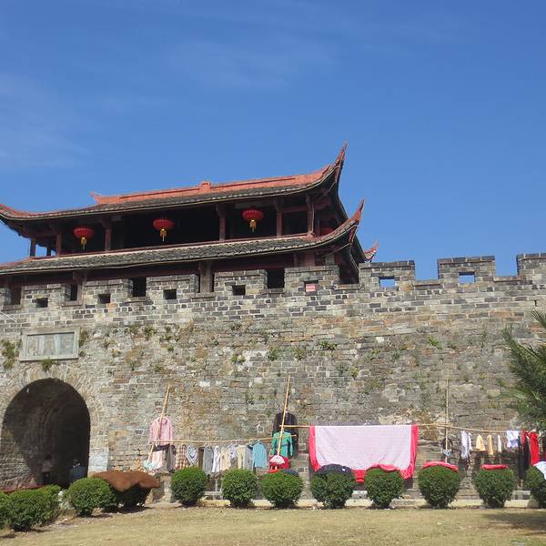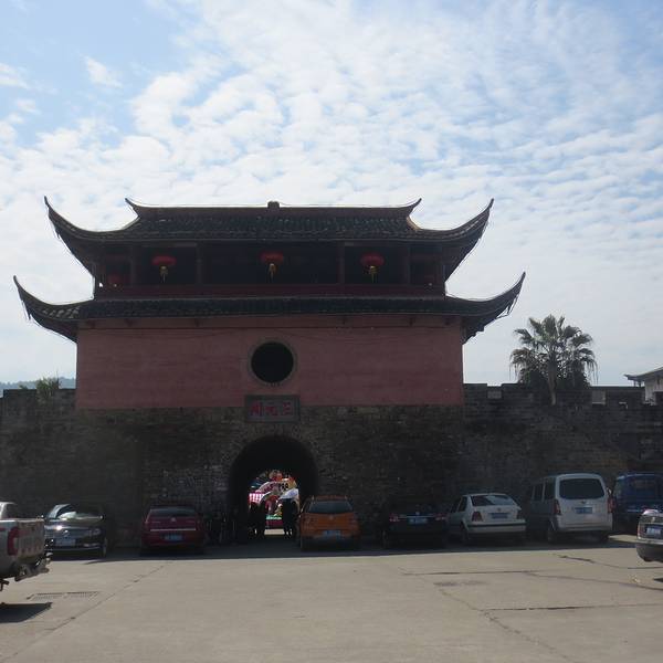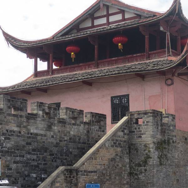 三元阁原是唐代古城门,始建于大历年间,为汀州刺史陈剑迁州筑城时的南大门,原名鄞江门。明洪武四年,汀州卫指挥王圭改名为广储门,弘治十二年,汀州卫指挥建广储门楼。明崇帧年间加以扩修,始名三元阁。三元者,状元、会元、解元。其阁正对汀州试院。志载,原为“四檐三层”,“明崇祯间,改合郡县二城炎一,知府笪继良因葺广储门楼更名为阁”。阁上设对着试院的魁星塑像,象征振文风盛科举之意。如果有机会鸟瞰长汀城,会看到古城墙以汀江为界向向两边延伸至卧龙山顶,经山脉蜿蜒而下将整个城包围,恰似一串挂在脖子上的佛珠,被称为“佛挂珠”。身处穿河而过的汀江古城,沿河的古城墙又成了护城河,看上去几分神秘几分沧桑。