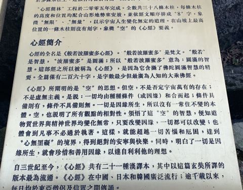 去大屿山都会去宝莲禅寺和天坛大佛,这两个地方也非常好找,不可能错过。周边环境幽静祥和,非常值得一去去大屿山都会去宝莲禅寺和天坛大佛,这两个地方也非常好找,不可能错过。但是如果你不提前了解的话,心经简林是很容易错过的,其实这个地方更值得去。沿着宝莲禅寺牌坊内侧有一条延伸到山里的小路,顺着小路走15...去大屿山都会去宝莲禅寺和天坛大佛,这两个地方也非常好找,不可能错过。但是如果你不提前了解的话,心经简林是很容易错过的,其实这个地方更值得去。沿着宝莲禅寺牌坊内侧有一条延伸到山里的小路,顺着小路走15分钟左右就会到达心经简林,路边一直有路标。心经简林再往里可以徒步凤凰山。而且附近有一家青年旅舍,一路遇到不少外国人。心经简林是国学大师饶宗颐教授书写的《般若波罗蜜多心经》,刻在户外巨大木柱上。周边环境幽静祥和,非常值得一去。 展开
