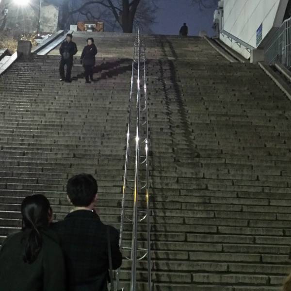 这个是问了缆车工作人员才大致清楚的方向,具体就是南山缆车返回之后,出了缆车站楼,直走一点到马路上往右边走可以看到一家杂货铺,继续往前走啊走走啊走,看到状似图书馆建筑的时候就到了,走到一半因为迷茫想放弃时,一位热情的正锻炼身体的大爷搭话问去哪儿,然后就给大叔看了图片,大爷就明白了是三顺阶梯,然后说跟他走就是了,我们一路小跑得跟着大爷到达了(其实我们走的方向是对的),过马路的时候大爷还教了我们按信号灯下的按钮,至于有什么用不太明确,到达和大爷道谢后,大爷就麻溜得往上爬。
