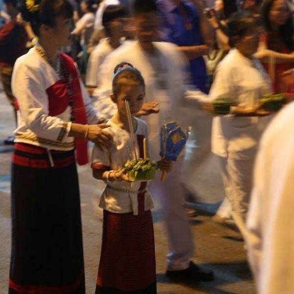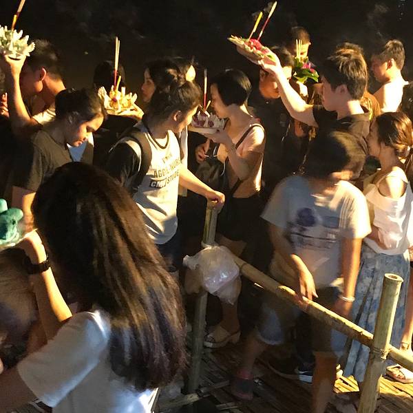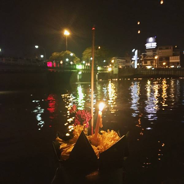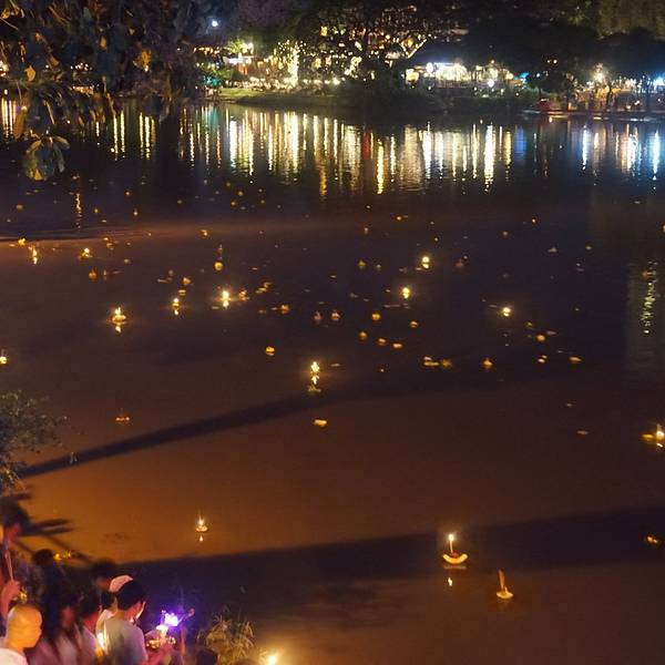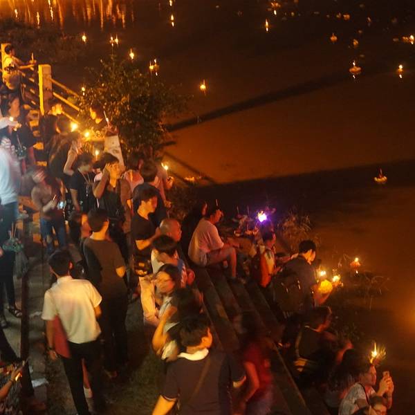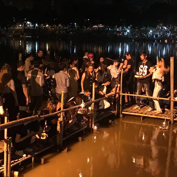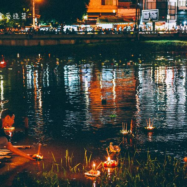 没有去万灯施放没关系,我已经很满足了。根据去年取消免费场的经验来说,除了官方举办的Maejo大学的收费场之外,在Ping河以及古城的护城河边,限定时间段是可以集体燃放天灯的~ 也很壮观哦!夜幕低垂,水灯节最美丽的时光开始,可以看见红男绿女,或是父母偕同子女,人人手捧着各式各样造型的水灯,或是塔形丶船形和莲花形等等,其中尤以莲花造型的水灯最多最美。水灯中间,插有香烛丶鲜花和彩色的小纸旗,以表示礼佛,也有在水灯上放数枚硬币,表示布施。在放水灯前,人人都会在点燃香烛后,闭上眼睛,口中喃喃有辞,或在祝祷家人一年平安丶幸福,或祈求孩子学业进步。不过更多青年男女,相携来放水灯,多是为爱的祈祷,希望早缔良缘,爱情永远。 泰国水灯节水灯节之夜,总是越晚越热闹。只见人潮都涌向河畔或港渠丶湖滨,凡有水的地方,都挤满了放水灯和看水灯的人群。