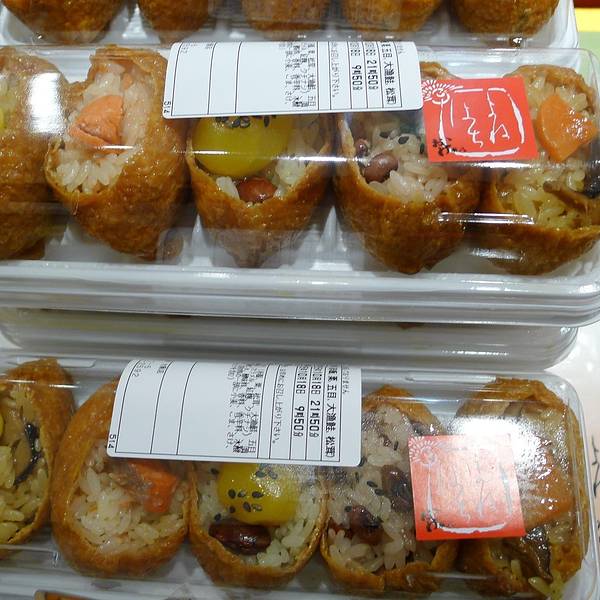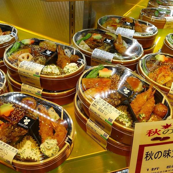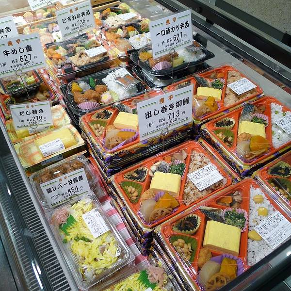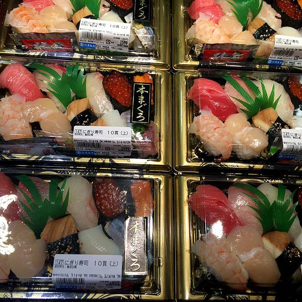 B1层的美食多多,买了寿司、麦片和水果罐头。