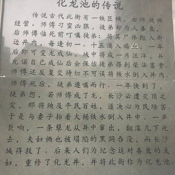 周边是著名的化龙池酒吧在长沙市的市中心,人民路那一带,有一个不起眼的小巷子,走进去40-50米,就看到化龙池,这里有一个老长沙的故事,据说这井里锁着一条恶龙。周边是著名的化龙池酒吧。