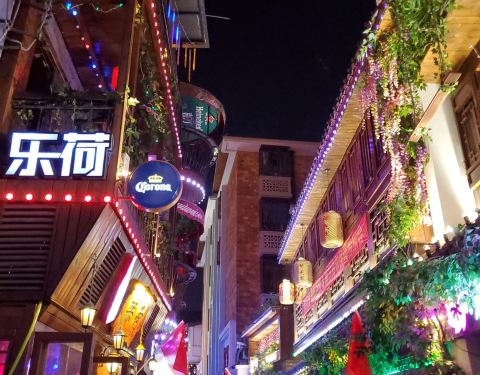 超级可爱。一条小的酒吧街,里面大多都是清吧,没有那么吵,我们去的时候赶上高考,并没有那么热闹一条小的酒吧街,里面大多都是清吧,没有那么吵,我们去的时候赶上高考,并没有那么热闹。我们去转了一下,酒吧街里面有一间酒吧门口有只大金毛坐在桌子上面。超级可爱。