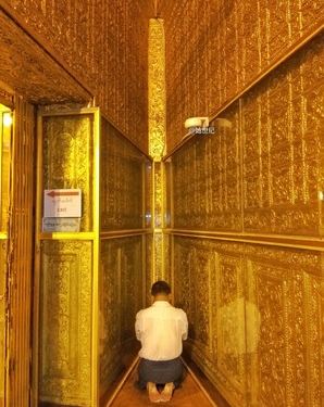 门票贵,虽然内部是金的但是很小,很多当地人对着一个角祈祷 外部挺大的,也有几个寺庙可以看看,但是没什么特色 这座塔是中空塔,内部建有黄金屋密室。而且这座金塔目前正在修善中,但吸引我的是一道钢绳上来回行驶的漂亮小车。据说里面放的是纸条,把心愿写在纸条上,它可以传递到塔中,替你完成心愿。据说每对结婚前的新人必到此地俸拜,才能一生幸福。