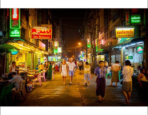 仰光或许没有曼谷一般迷醉的夜生活,但她却有属于她的那一片不夜天。每天晚上6点开始,唐人街的霓虹便渐渐阑珊。这里有许多华人开的餐馆,在街边的小吃摊也经常可以碰到华人老板在叫卖。