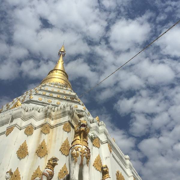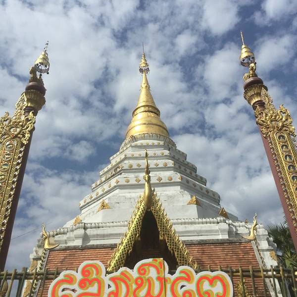 从双龙寺坐双条车回清迈古城,叫司机把我们送到凤飞飞猪脚饭的地方,在附近下车后看到这座清韵寺 寺庙,其实它就是在清迈古城北城门外的长帕市场附近。相比其他的寺庙感觉这里较为隐秘,寺庙是一座造型独特的古寺。远远就可以看见金色的塔顶,塔底是白色的建筑。在旁边就是金色的佛像。