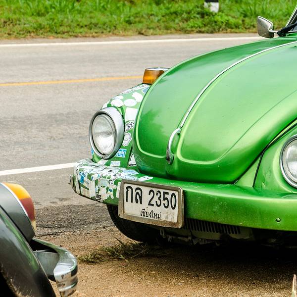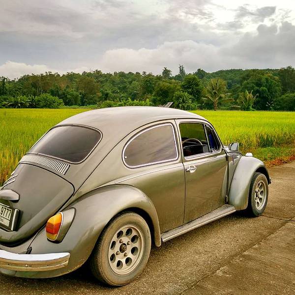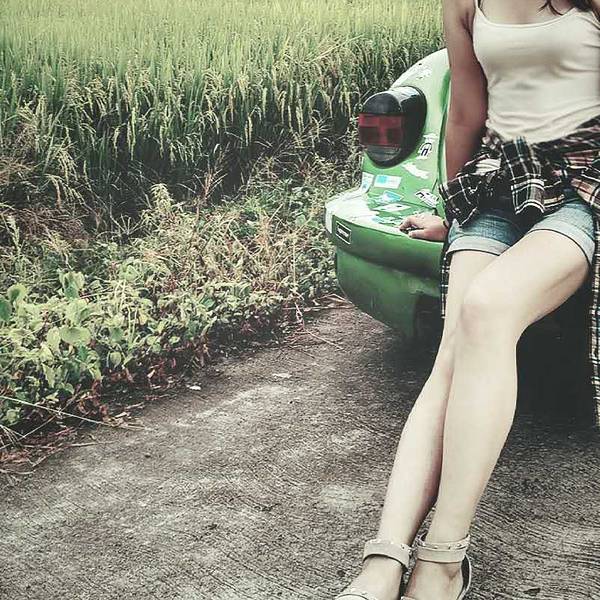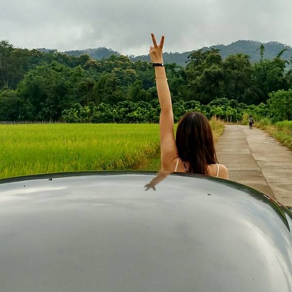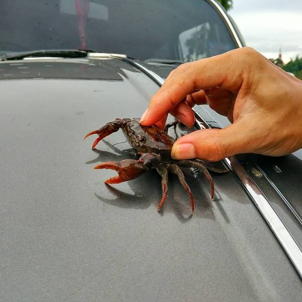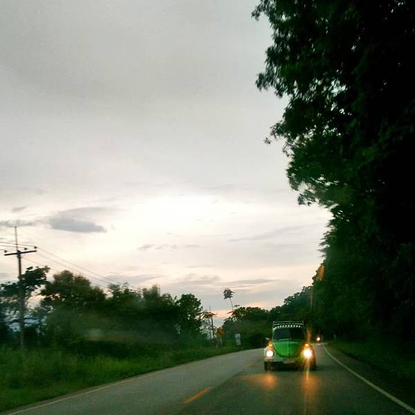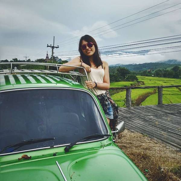 吃饱喝足休息完,雨也停了。出发去田野! 田野边的观景台旁,是凹造型时间。小灰和小绿完全沦为两个凹造型的大道具。看多了阳光明媚下的田野,其实阴雨天的田野也别有一番风情。看远处水汽环绕着的山,反而多了一丝柔和。而此时的我却已经晒得和泰国人的肤色没什么两样了给小绿的眼睛来张特写。在观景台上看还不过瘾,我们又把车开到了田野边上。。。。。额。。。继续凹造型请忽略已经被晒得一截黑一截白的熊猫手臂天涯则调皮地抓起了螃蟹。。。。抓了还不算,还要强迫螃蟹大哥和小灰拍合照,也真是醉醉的了清道和清迈间大概车程在3小时左右。看着时间差不多了,我们打算打道回府啦。 之前来田野的时候路过这么条长得很重庆的路,回去的时候,摄影师同志让天涯在这条路的最高点停了下,拍了这张,事后发表评论说还是重庆的路更陡一点。悄悄地晚上8点左右回到的酒店,发现晚饭还木有吃。在宁曼路上找到一家店面很小的吃小规模自助的,非常不推荐,很难吃。这美好的一天,虽然有顿不令人愉快的晚饭,但丝毫不影响白天的各种圆满。躺在小灰后座拍跟在小灰后头的小绿