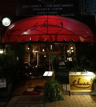 La Fourchette是家相当有情调的法国餐厅,位于清迈古城旧市街。一进去你一定会爱上它的内部装修和餐厅的各种可爱装饰。桌子摆放整齐,餐桌餐巾是非常正经的餐巾,这么正式即使在如今的欧洲餐厅也不多见了。高档餐...La Fourchette是家相当有情调的法国餐厅,位于清迈古城旧市街。一进去你一定会爱上它的内部装修和餐厅的各种可爱装饰。桌子摆放整齐,餐桌餐巾是非常正经的餐巾,这么正式即使在如今的欧洲餐厅也不多见了。高档餐厅就应该这样啊。环境舒适温馨,桌子摆放的让人不觉得拥挤。气氛优雅舒适,晚餐音乐很温馨,是让人清醒的巴西音乐或者古典吉他曲。如果你想要一个浪漫的约会,来这儿准没错。